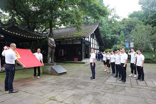 活動(dòng)首先參觀了朱德舊居陳列館,聆聽了朱德在瀘州期間戰(zhàn)斗、生活介紹,深入了解了偉人朱德在瀘州革命的豐功偉績(jī)和生平事跡。在朱德銅像前,支部書記黃修華同志帶領(lǐng)下,預(yù)備黨員余洪波同志舉行了入黨宣誓儀式,全體黨員、預(yù)備黨員重溫了入黨誓詞。