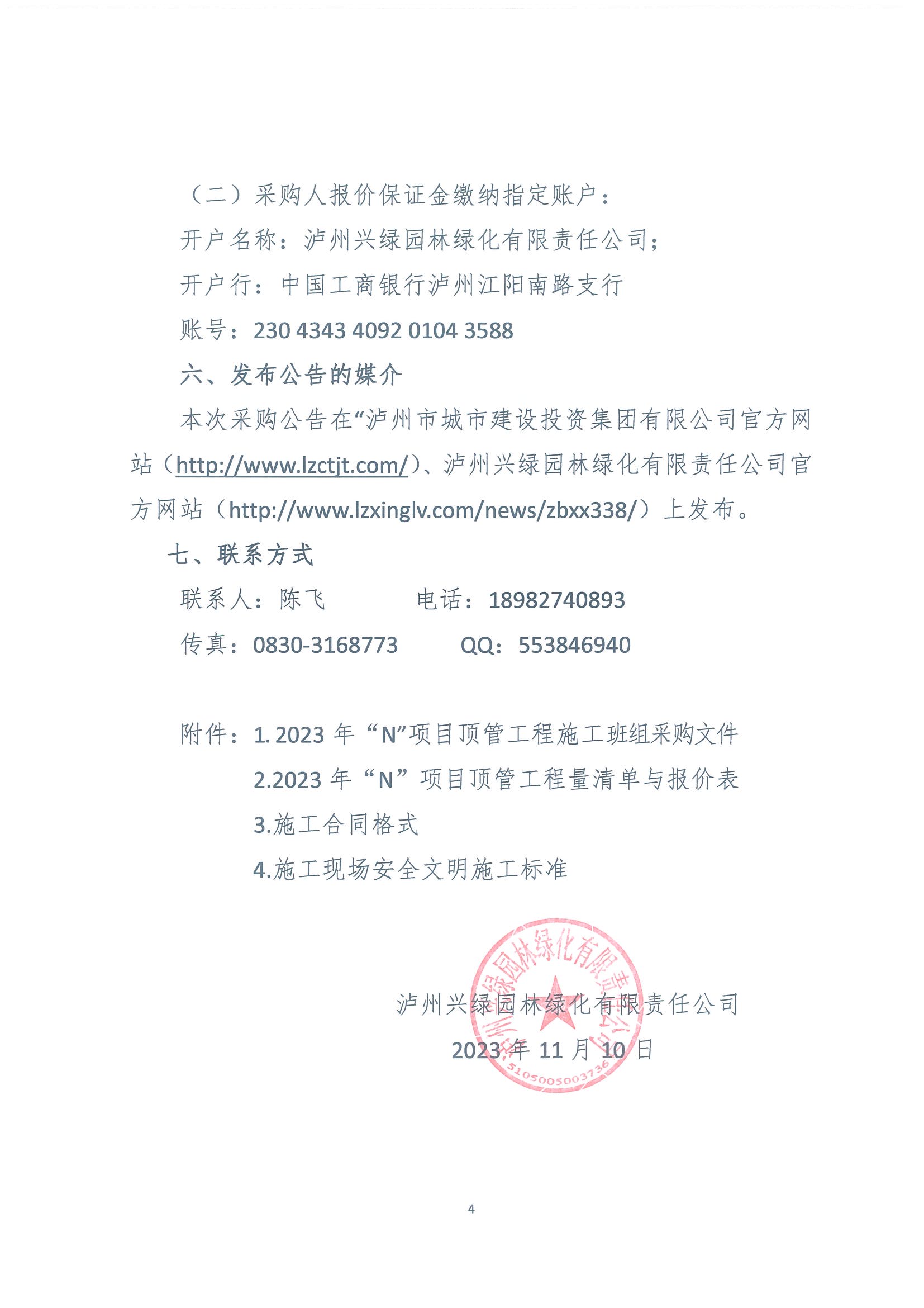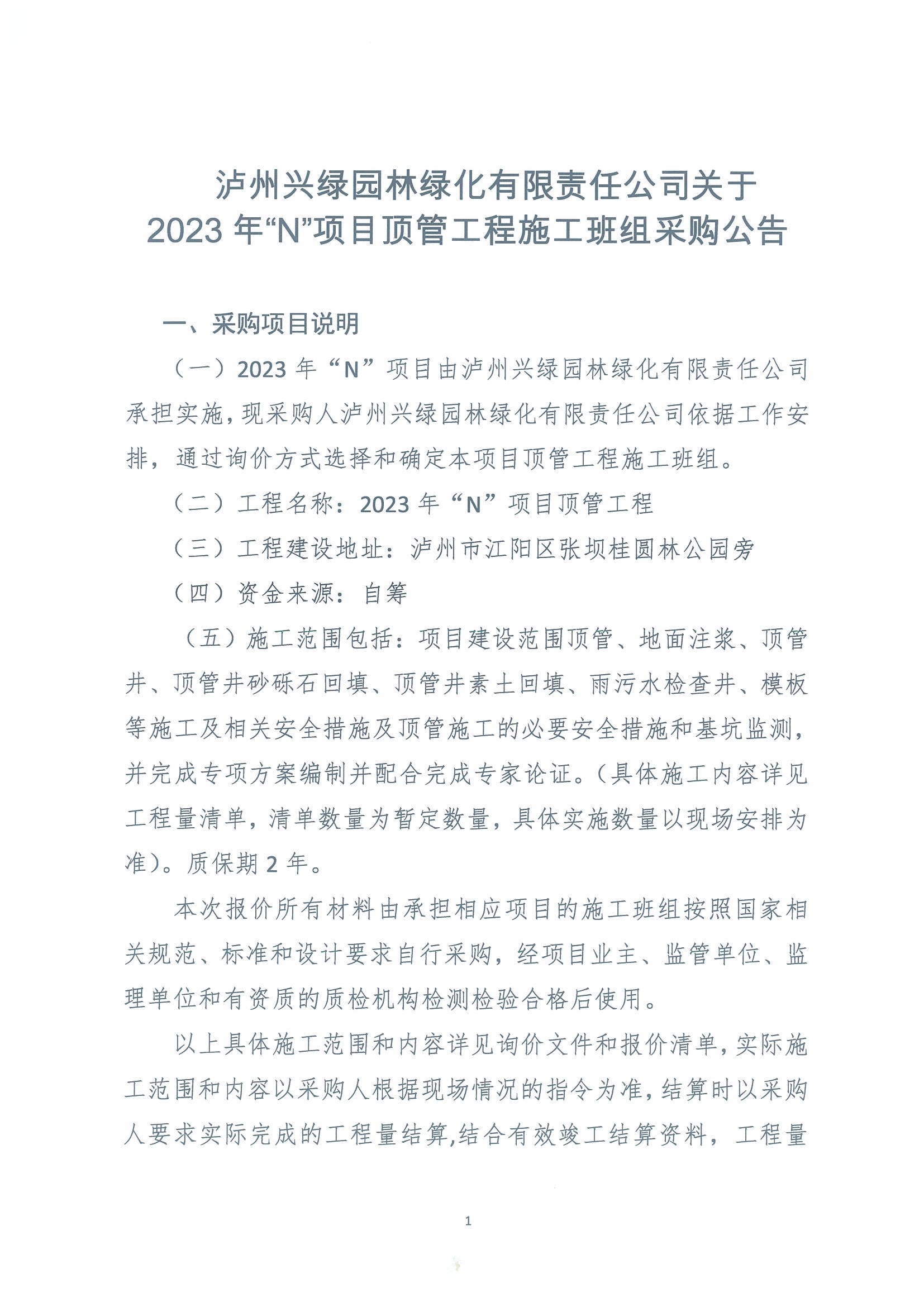 (一)2023年“N”項目由瀘州興綠園林綠化有限責(zé)任公司承擔(dān)實施,現(xiàn)采購人瀘州興綠園林綠化有限責(zé)任公司依據(jù)工作安排,通過詢價方式選擇和確定本項目頂管工程施工班組。