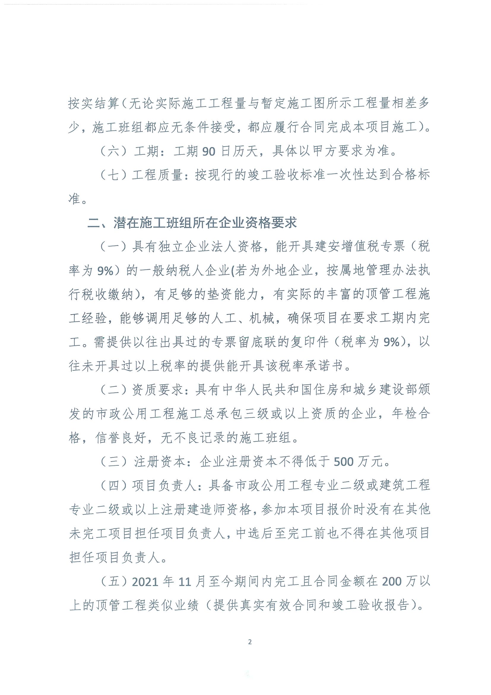 (二)資質(zhì)要求:具有中華人民共和國住房和城鄉(xiāng)建設(shè)部頒發(fā)的市政公用工程施工總承包三級或以上資質(zhì)的企業(yè),年檢合格,信譽(yù)良好,無不良記錄的施工班組。
