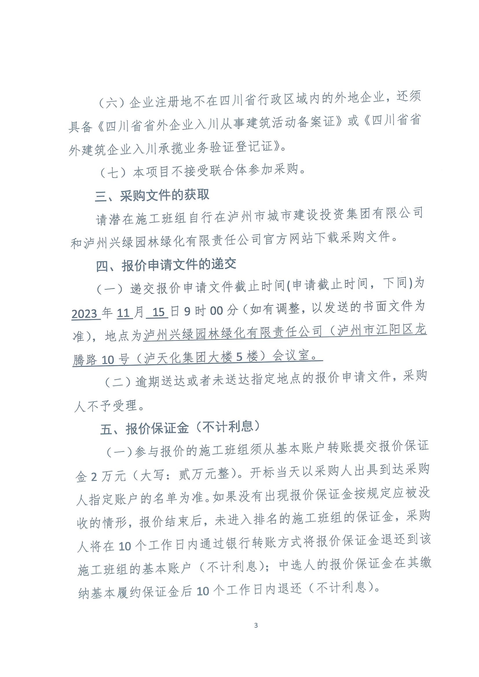請潛在施工班組自行在瀘州市城市建設(shè)投資集團(tuán)有限公司和瀘州興綠園林綠化有限責(zé)任公司官方網(wǎng)站下載采購文件。